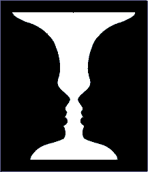 La percepción sucede en forma de «recortes»; percibimos zonas del campo perceptual en las que centramos la atención y a las que llamamos «figura» y zonas circundantes que quedan justamente en un plano de menor jerarquía al que denominamos «fondo». Este fenómeno tiene que ver con la anatomía del ojo, cuya retina en su zona central posee una mayor cantidad de receptores que en la zona periférica lo que ofrece una zona de mayor definición. De la misma forma funciona la conciencia, con un foco al que llamamos «figura». El conjunto figura-fondo constituye una totalidad o Gestalt. Esto significa que no existe figura sin un fondo que la sustente (aunque el fondo justamente esté constituido por un espacio vacío, ese vacío es soporte de la figura, pues existe percepción del mismo. Según el lugar donde posemos la atención pueden emerger diferentes figuras de lo que antes era el «fondo». Por ejemplo, en una obra teatral podemos mirar a la primera actriz y hacer figura en toda ella, o en un detalle de su traje, pero también podemos al instante siguiente cambiar a un detalle del decorado que será a nueva figura y la primera actriz pasará a ser parte del fondo. En ocasiones el conjunto está compuesto por estímulos de igual intensidad como es el caso de los perfiles y el cáliz que vemos a la izquierda, y en ocasiones los campos difusos e inestructurados o cambiantes dificultan la posibilidad de aislar y percibir una figura«nítida», es decir de diferenciar figura-fondo. Esto muchas veces nos sucede frente a situaciones en las que no podemos hacer figura y aislar un componente porque varios de ellos se nos imponen o ninguno. La percepción de campos inestructurados o difusos provoca un efecto desestructurante sobre la psiquis, confunde. La mente «quiere» figuras claras para focalizar o enlazar su energía, es así que cuando no podemos reconocer forma familiar puede devenir ansiedad, (energía no ligada a una forma definida) Como sucede con las obras de arte abstracto, siempre intentamos darles un ordenamiento y una interpretación conforme a la propia experiencia. En esta característica se basan los tests proyectivos y psicodiagnósticos como el Rorschach. Cunado menos clara es la figura, mayor es la cantidad de contenidos inconscientes que proyectamos en ella a fin deorganizarla según la propia experiencia.